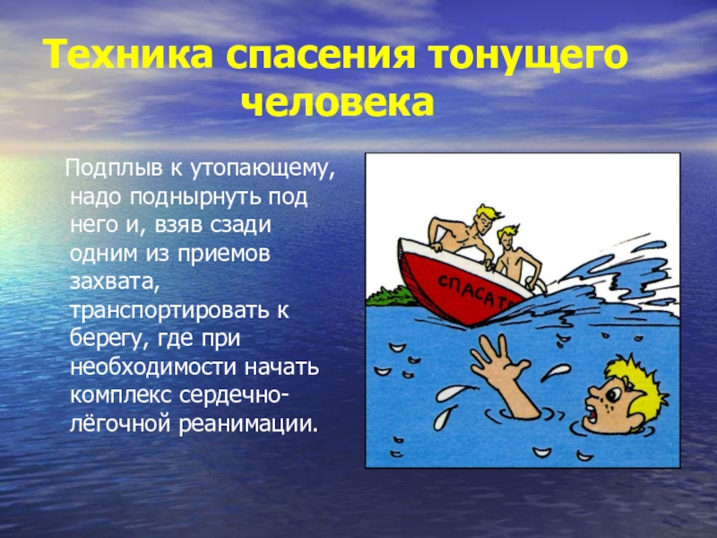Подплыв к утопающему, надо поднырнуть под него и, взяв сзади одним из приемов захвата, транспортировать к берегу, где при необходимости начать комплекс сердечно-лёгочной реанимации.