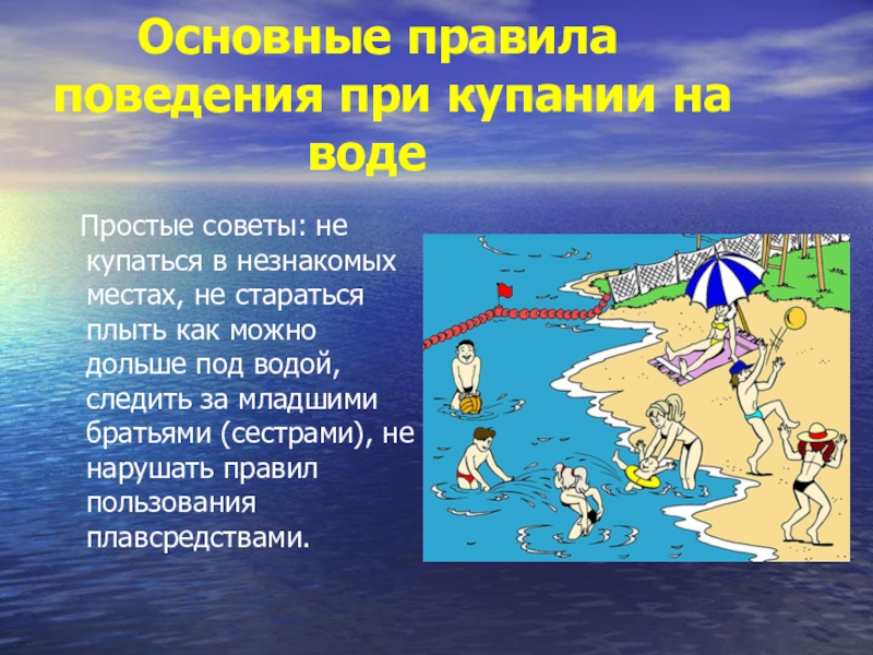 Простые советы: не купаться в незнакомых местах, не стараться плыть как можно дольше под водой, следить за младшими братьями (сестрами), не нарушать правил пользования плавсредствами.