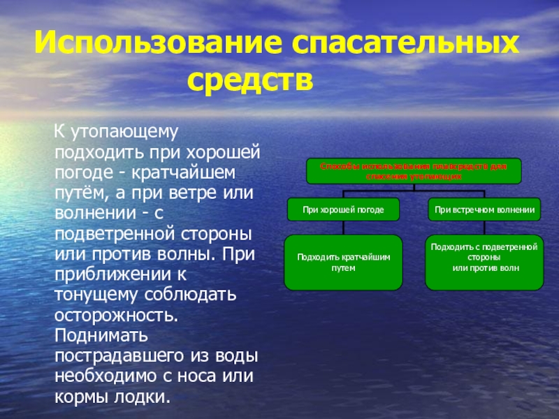 Подплыв к утопающему, надо поднырнуть под него и, взяв сзади одним из приемов захвата, транспортировать к берегу, где при необходимости начать комплекс сердечно-лёгочной реанимации.