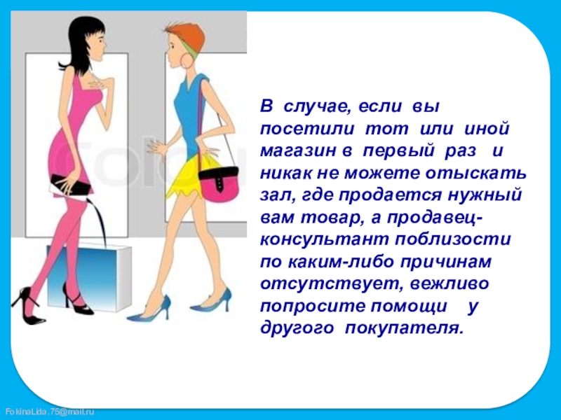 раз и никак не можете отыскать зал, где продается нужный вам товар, а продавец-консультант поблизости по каким-либо причинам отсутствует, вежливо попросите помощи у другого покупателя.