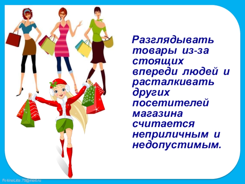 Разглядывать товары из-за стоящих впереди людей и расталкивать других посетителей магазина считается неприличным и недопустимым.