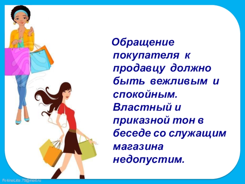 Обращение  покупателя к продавцу должно быть вежливым и спокойным.