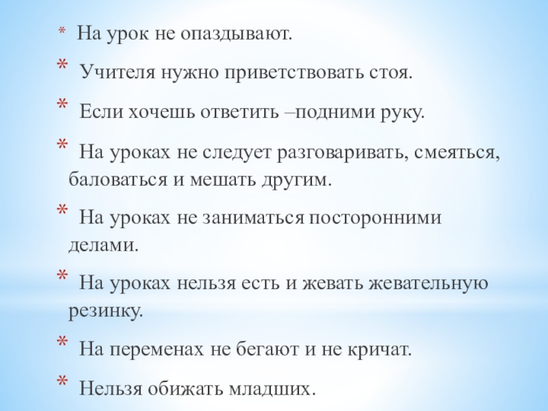 На уроках не следует разговаривать, смеяться, баловаться и мешать другим.