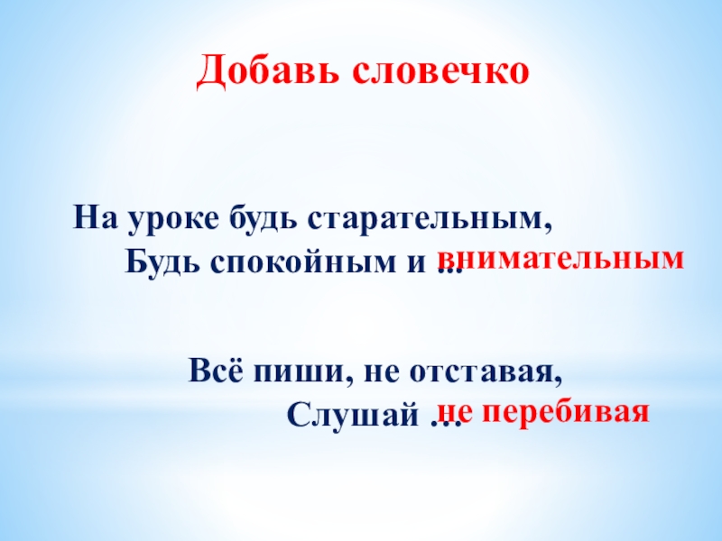 4. На уроке внимательно слушай учителя, не перебивай.