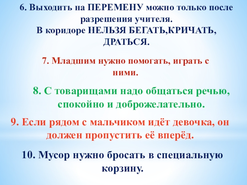9. Если рядом с мальчиком идёт девочка, он должен пропустить её вперёд.