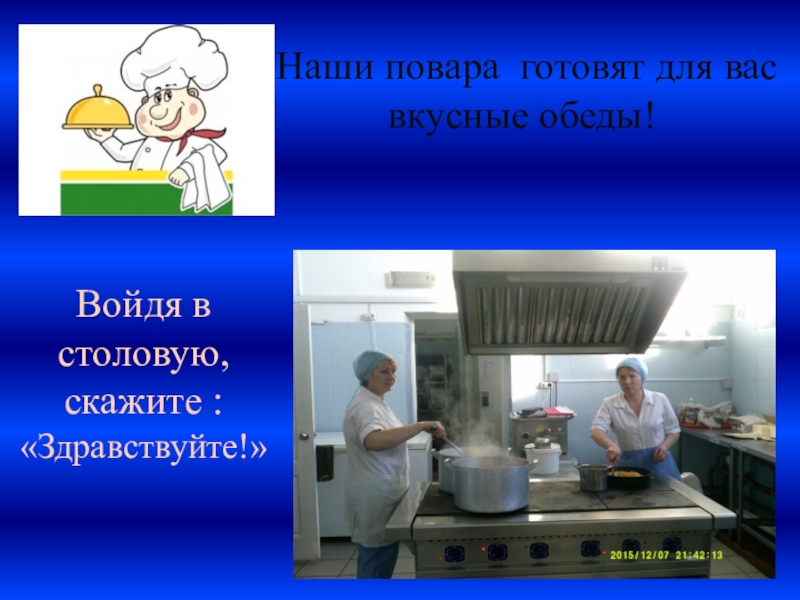 Войдя в столовую, скажите : «Здравствуйте!» Наши повара готовят для вас вкусные обеды!