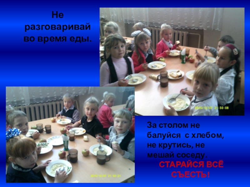Не разговаривай во время еды.За столом не балуйся с хлебом, не крутись, не мешай соседу. СТАРАЙСЯ ВСЁ