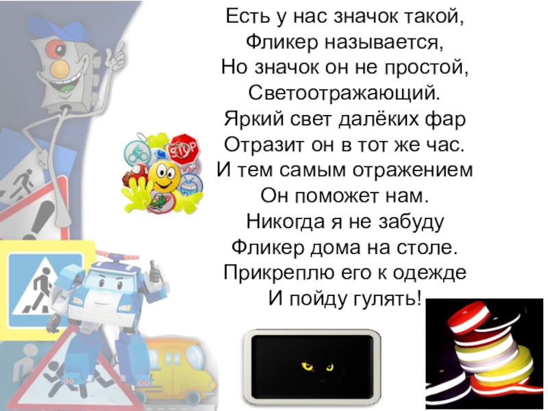 Есть у нас значок такой,Фликер называется,Но значок он не простой,Светоотражающий.Яркий свет далёких фарОтразит он в тот же