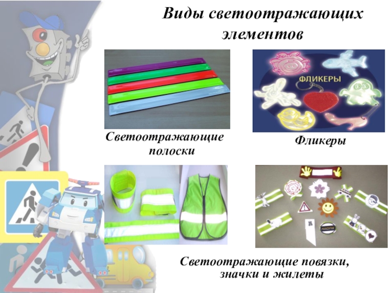 Виды светоотражающих элементовСветоотражающие полоски   ФликерыСветоотражающие повязки, значки и жилеты