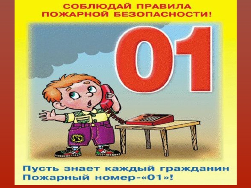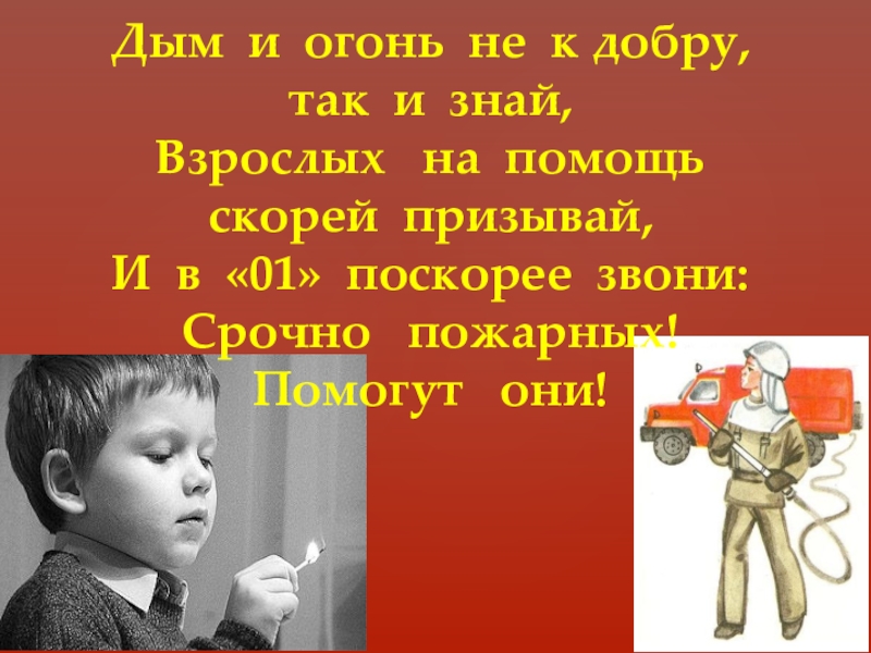 помощь скорей призывай, И в «01» поскорее звони: Срочно пожарных! Помогут они!
