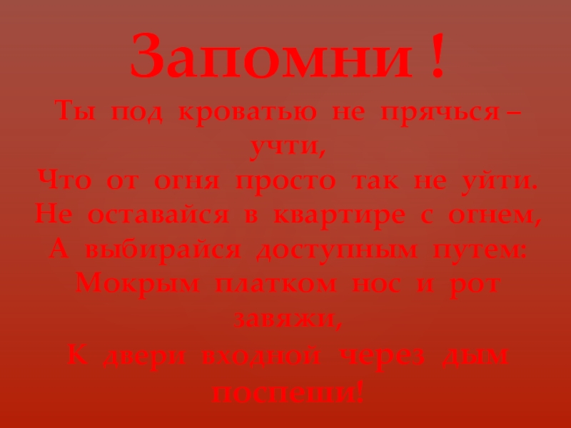 Слайд 19Запомни ! Ты под кроватью не прячься – учти, Что от огня просто