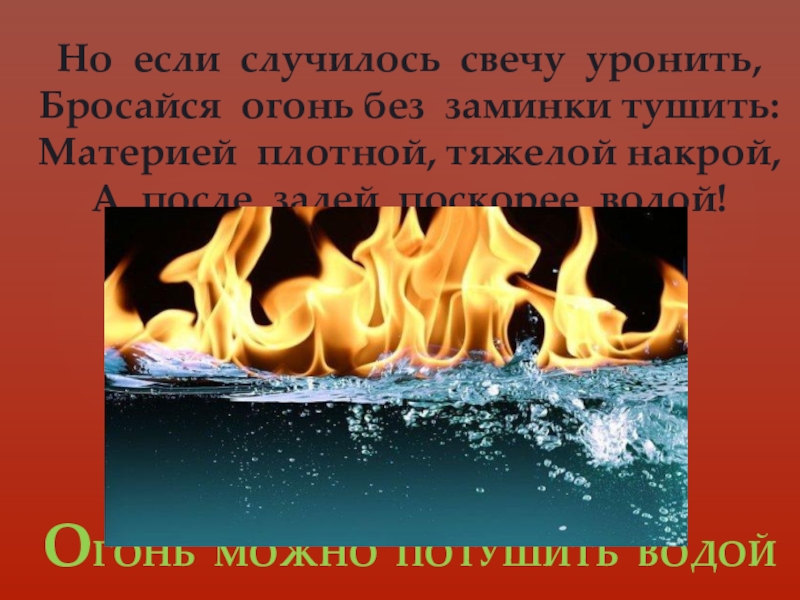 Слайд 16 Но если случилось свечу уронить, Бросайся огонь без заминки тушить: Материей плотной, тяжелой