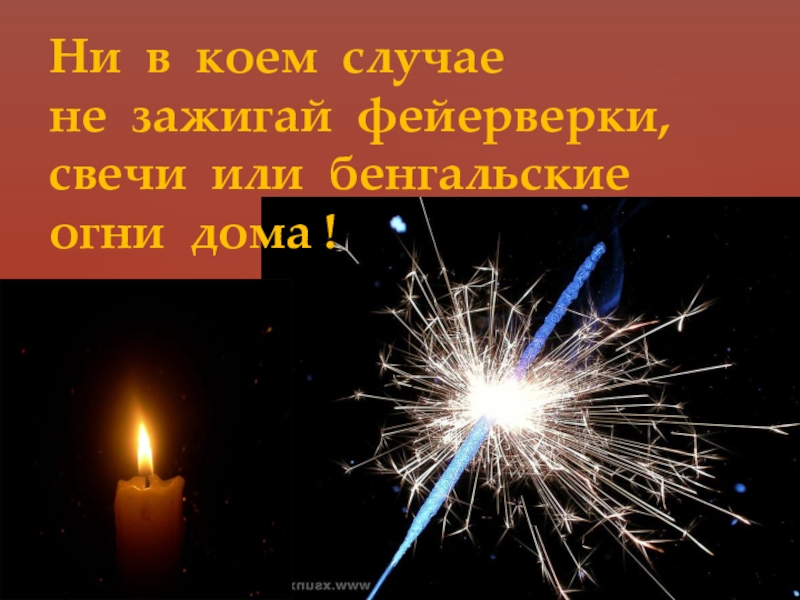 Слайд 14Ни в коем случае не зажигай фейерверки, свечи или бенгальские огни