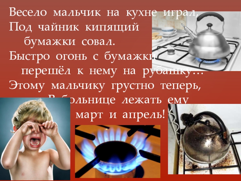 Слайд 9Весело мальчик на кухне играл, Под чайник кипящий бумажки