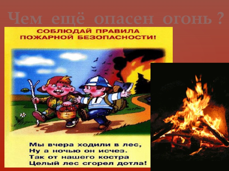 С открытым огнем обращаться опасно! Не жги ты ни свечки, ни спички напрасно. А если зажег -