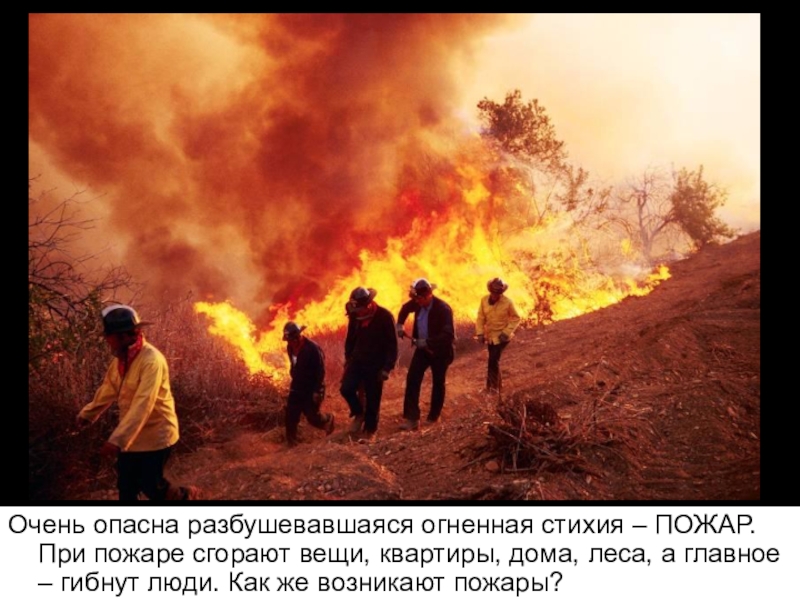 Слайд 7Очень опасна разбушевавшаяся огненная стихия – ПОЖАР. При пожаре сгорают вещи,