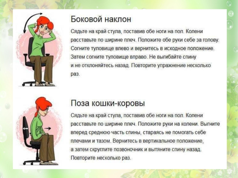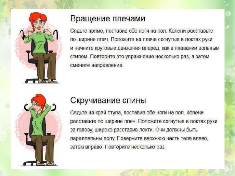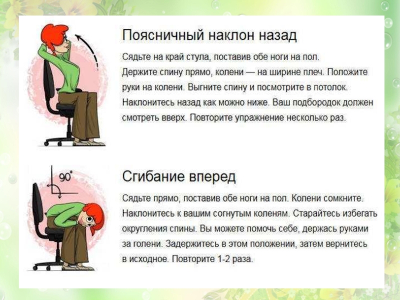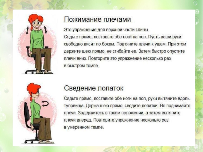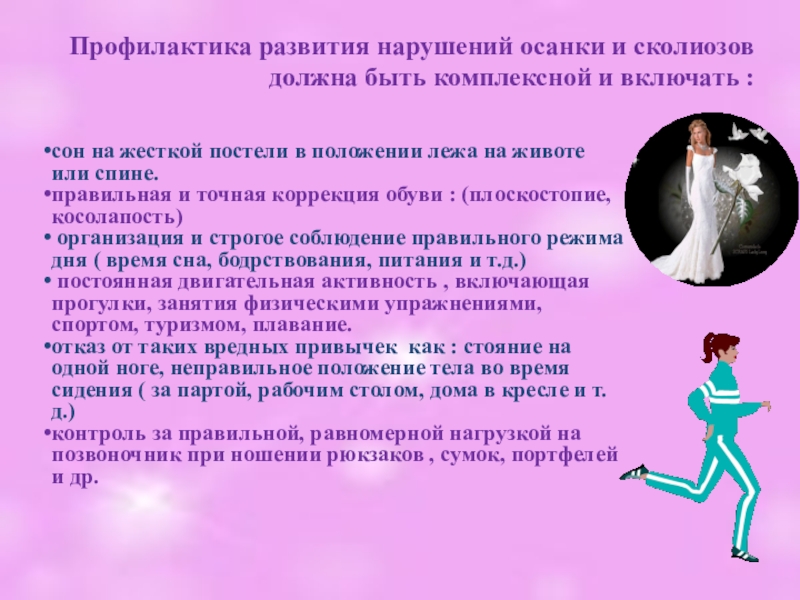 отказ от таких вредных привычек как : стояние на одной ноге, неправильное положение тела во время сидения ( за партой, рабочим столом, дома в кресле и т.д.)