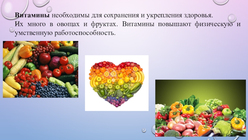 Витамины необходимы для сохранения и укрепления здоровья. Их много в овощах и фруктах. Витамины повышают физическую и умственную