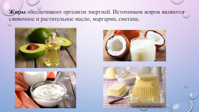 Слайд 7Жиры обеспечивают организм энергией. Источником жиров являются сливочное и растительное масло, маргарин,