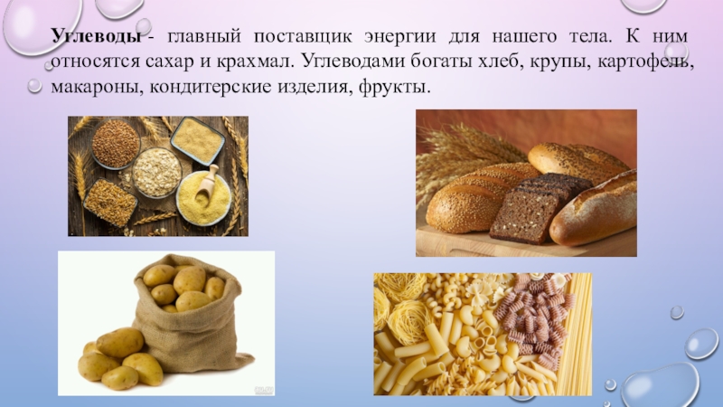 Углеводы - главный поставщик энергии для нашего тела. К ним относятся сахар и крахмал. Углеводами богаты хлеб, крупы,