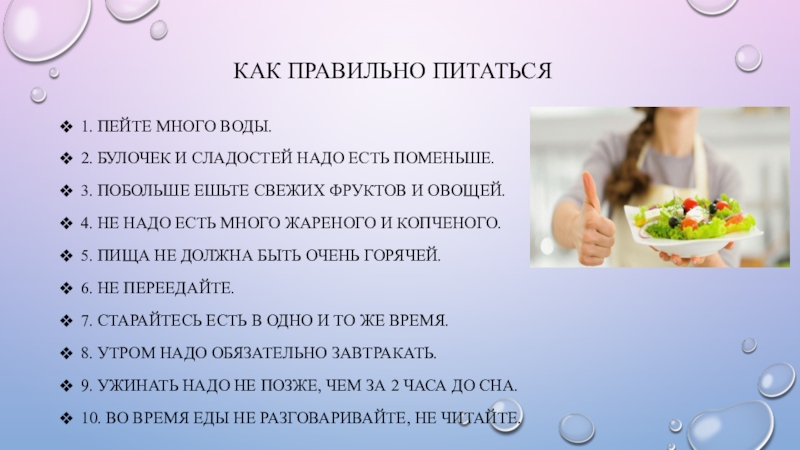 Как правильно питаться1. Пейте много воды.2. Булочек и сладостей надо есть поменьше.3. Побольше ешьте свежих фруктов и