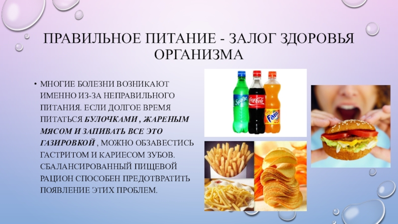 питания. Если долгое время питаться булочками , жареным мясом и запивать все это газировкой , можно обзавестись гастритом и кариесом зубов. Сбалансированный пищевой рацион способен предотвратить появление этих проблем.