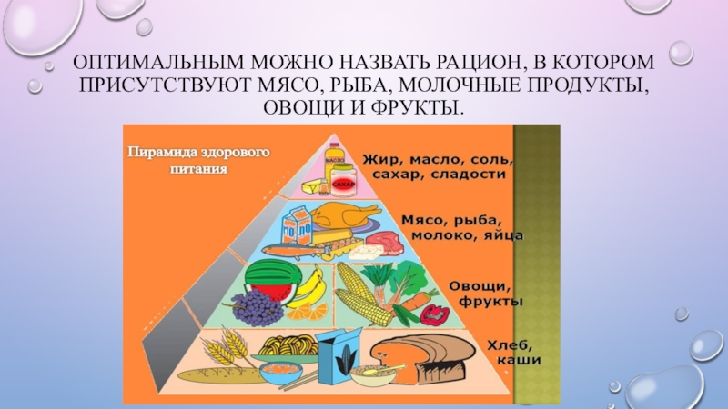 Слайд 3Оптимальным можно назвать рацион, в котором присутствуют мясо, рыба, молочные продукты,