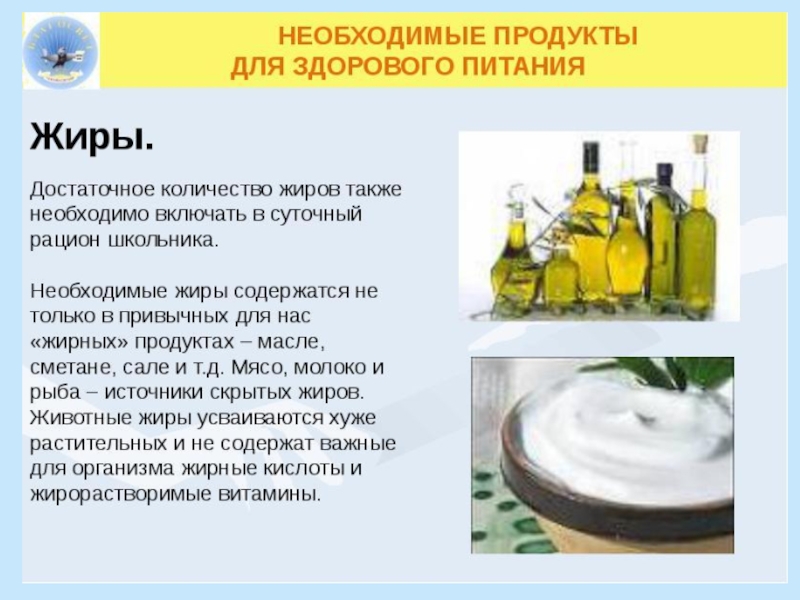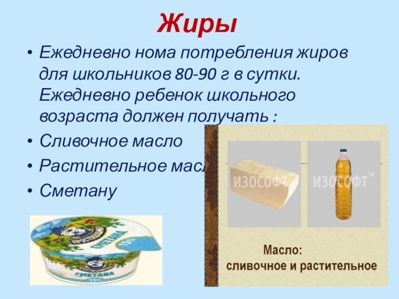 ЖирыЕжедневно нома потребления жиров для школьников 80-90 г в сутки. Ежедневно ребенок школьного возраста должен получать :Сливочное