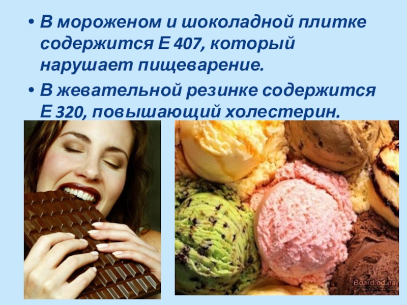 В мороженом и шоколадной плитке содержится Е 407, который нарушает пищеварение.В жевательной резинке содержится Е 320, повышающий