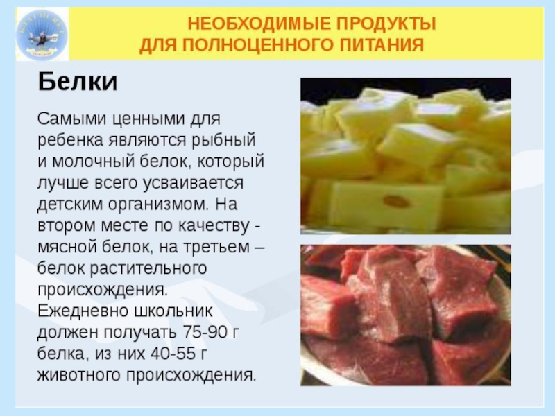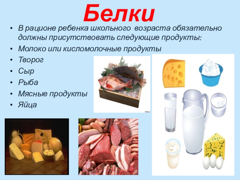 БелкиВ рационе ребенка школьного возраста обязательно должны присутствовать следующие продукты:Молоко или кисломолочные продуктыТворогСырРыбаМясные продуктыЯйца