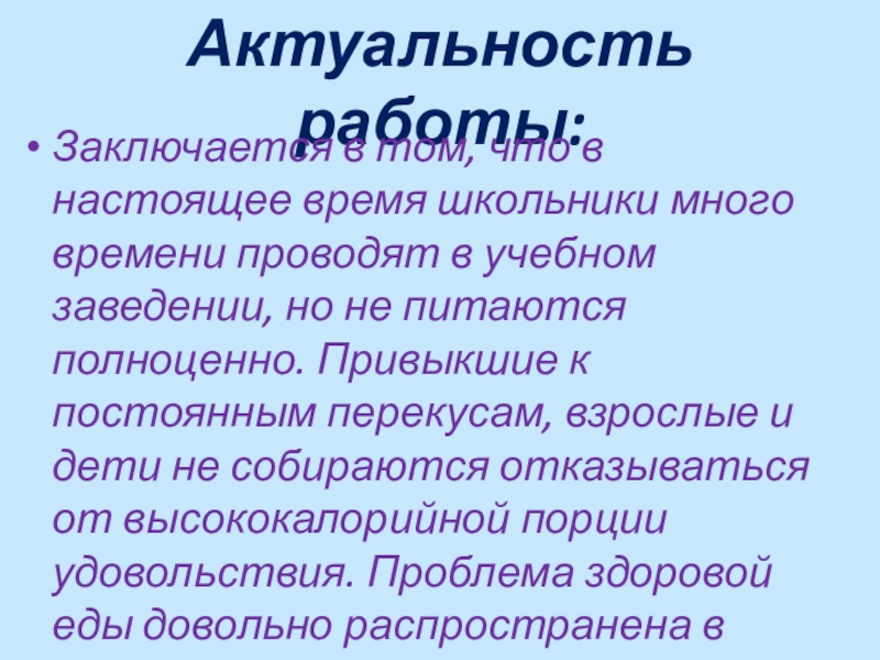 проводят в учебном заведении, но не питаются полноценно. Привыкшие к постоянным перекусам, взрослые и дети не собираются отказываться от высококалорийной порции удовольствия. Проблема здоровой еды довольно распространена в современном обществе.