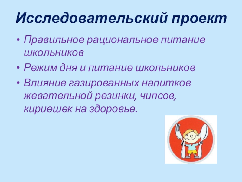Исследовательский проектПравильное рациональное питание школьниковРежим дня и питание школьниковВлияние газированных напитков жевательной резинки, чипсов, кириешек на здоровье.