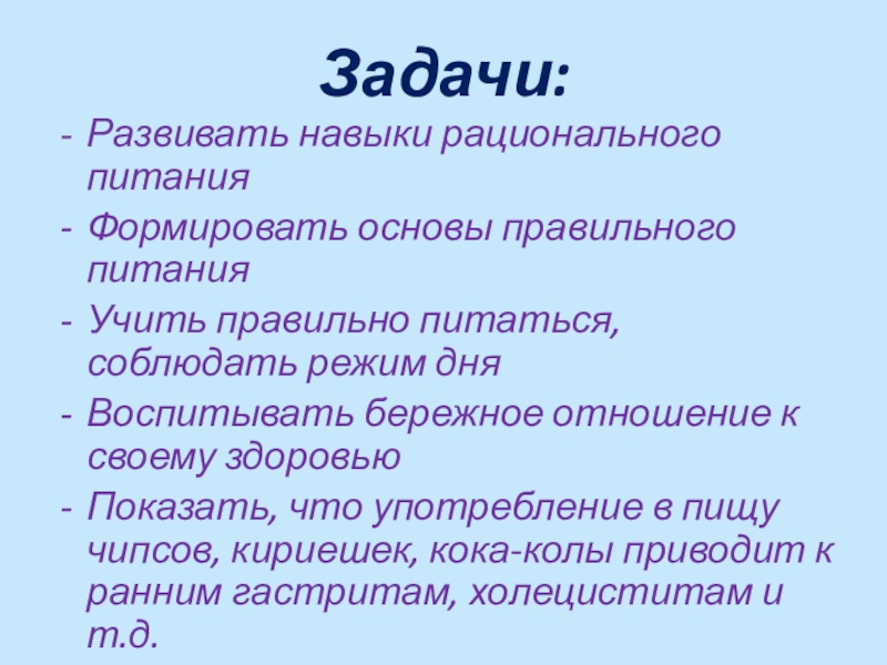 Задачи:Развивать навыки рационального питанияФормировать основы правильного питанияУчить правильно питаться, соблюдать режим дняВоспитывать бережное отношение к своему здоровьюПоказать,