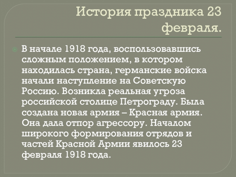 котором находилась страна, германские войска начали наступление на Советскую Россию. Возникла реальная угроза российской столице Петрограду. Была создана новая армия – Красная армия. Она дала отпор агрессору. Началом широкого формирования отрядов и частей Красной Армии явилось 23 февраля 1918 года.