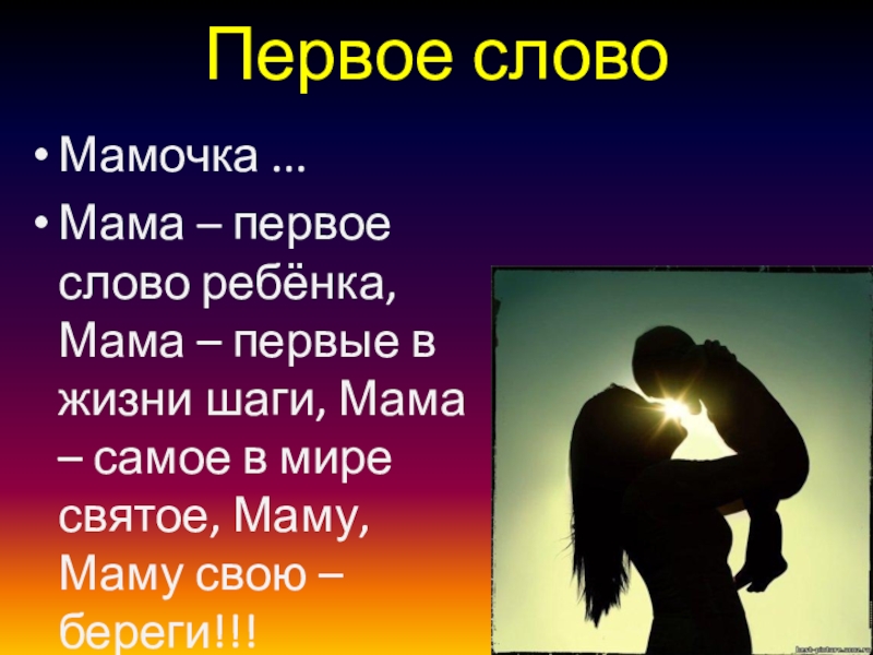 Первое словоМамочка ...Мама – первое слово ребёнка, Мама – первые в жизни шаги, Мама – самое в