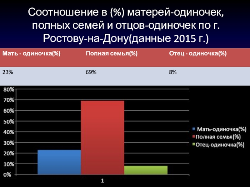 Слайд 6Соотношение в (%) матерей-одиночек, полных семей и отцов-одиночек по г. Ростову-на-Дону(данные