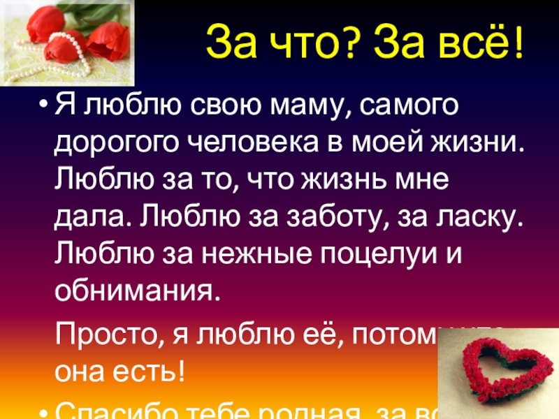 За что? За всё!Я люблю свою маму, самого дорогого человека в моей жизни. Люблю за