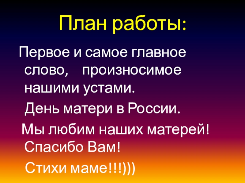 План работы: Первое и самое главное слово,  произносимое нашими устами.  День матери в России. Мы
