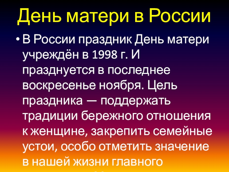 День матери в РоссииВ России праздник День матери учреждён в 1998 г. И празднуется в последнее воскресенье ноября.