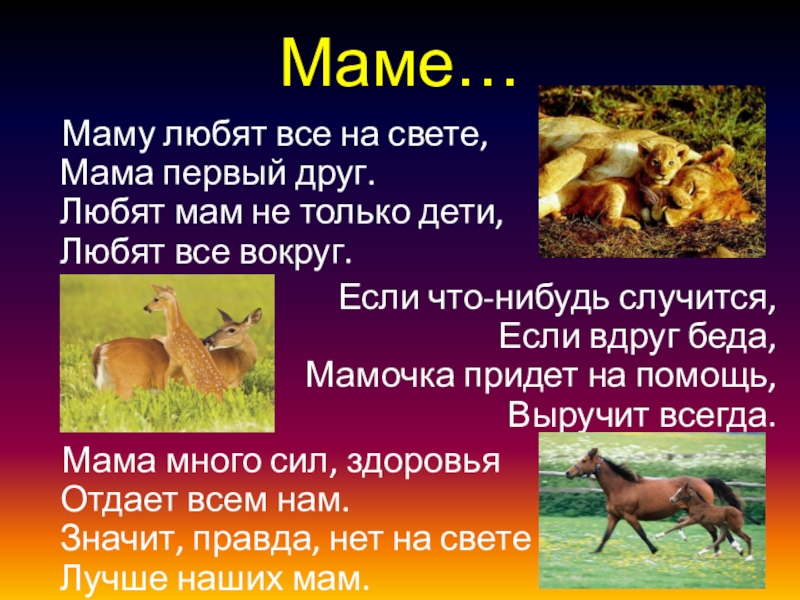 Маме…  Маму любят все на свете, Мама первый друг. Любят мам не только дети, Любят все