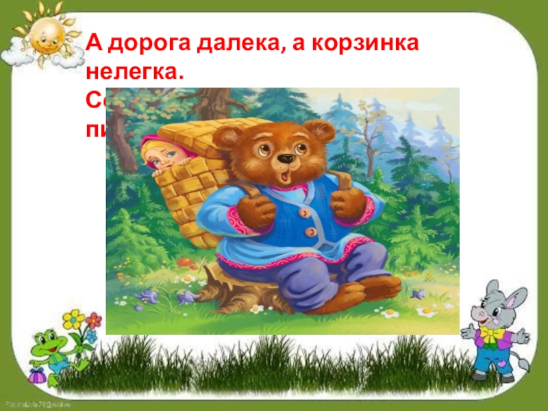 А дорога далека, а корзинка нелегка.Сесть бы на пенек, съесть бы пирожок!