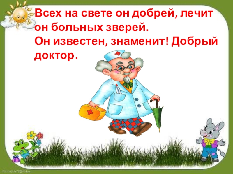 Всех на свете он добрей, лечит он больных зверей. Он известен, знаменит! Добрый доктор…