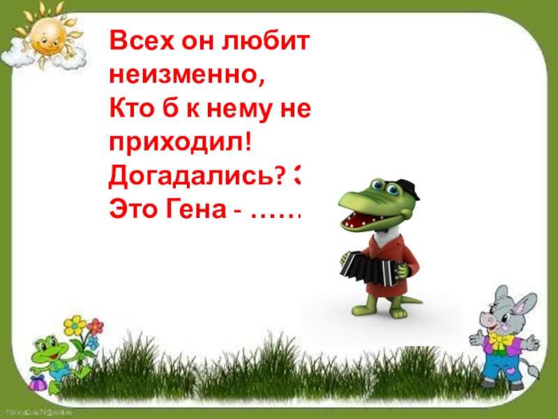 Всех он любит неизменно, Кто б к нему не приходил!Догадались? Это Гена!Это Гена - …………..