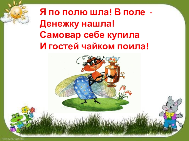 Я по полю шла! В поле - Денежку нашла!Самовар себе купилаИ гостей чайком поила!