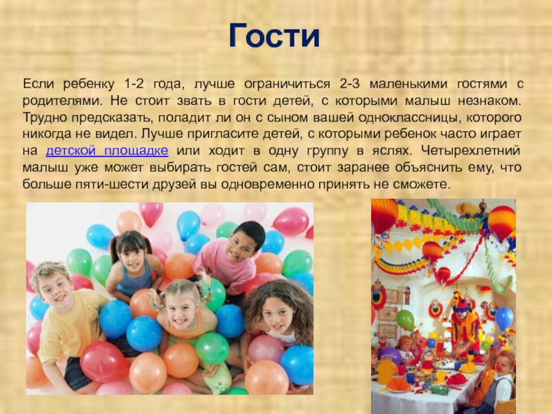 его друзья уже нагулялись, выспались и находятся в хорошем расположении духа. Обычно это четыре-пять часов вечера. Не надо продумывать многочасовую развлекательную программу – продолжительность вечеринки не должна превышать полутора-двух часов. В противном случае кто-то из «перегулявших» гостей может перевозбудиться и закатить истерику, а кто-то заснуть прямо на ковре.