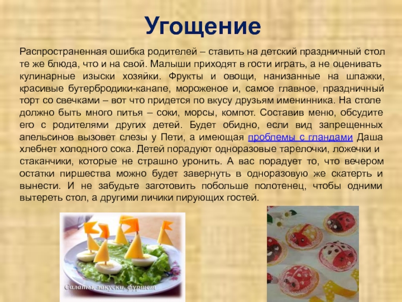 блюда, что и на свой. Малыши приходят в гости играть, а не оценивать кулинарные изыски хозяйки. Фрукты и овощи, нанизанные на шпажки, красивые бутербродики-канапе, мороженое и, самое главное, праздничный торт со свечками – вот что придется по вкусу друзьям именинника. На столе должно быть много питья – соки, морсы, компот. Составив меню, обсудите его с родителями других детей. Будет обидно, если вид запрещенных апельсинов вызовет слезы у Пети, а имеющая проблемы с гландами Даша хлебнет холодного сока. Детей порадуют одноразовые тарелочки, ложечки и стаканчики, которые не страшно уронить. А вас порадует то, что вечером остатки пиршества можно будет завернуть в одноразовую же скатерть и вынести. И не забудьте заготовить побольше полотенец, чтобы одними вытереть стол, а другими личики пирующих гостей.