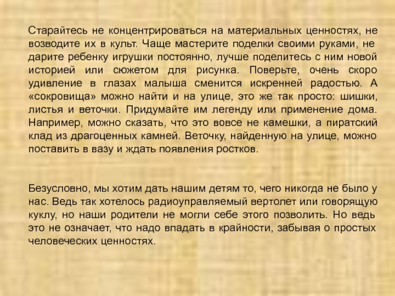 Безусловно, мы хотим дать нашим детям то, чего никогда не было у нас. Ведь так хотелось радиоуправляемый вертолет или говорящую куклу, но наши родители не могли себе этого позволить. Но ведь это не означает, что надо впадать в крайности, забывая о простых человеческих ценностях.