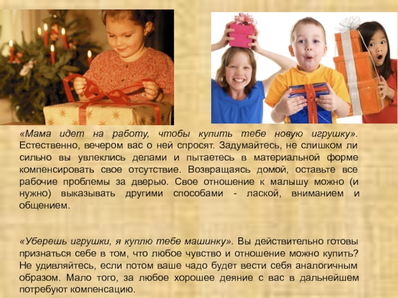 Слайд 12«Мама идет на работу, чтобы купить тебе новую игрушку». Естественно, вечером