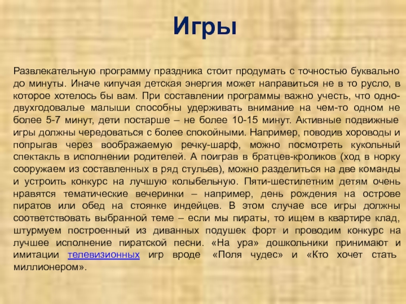 кипучая детская энергия может направиться не в то русло, в которое хотелось бы вам. При составлении программы важно учесть, что одно-двухгодовалые малыши способны удерживать внимание на чем-то одном не более 5-7 минут, дети постарше – не более 10-15 минут. Активные подвижные игры должны чередоваться с более спокойными. Например, поводив хороводы и попрыгав через воображаемую речку-шарф, можно посмотреть кукольный спектакль в исполнении родителей. А поиграв в братцев-кроликов (ход в норку сооружаем из составленных в ряд стульев), можно разделиться на две команды и устроить конкурс на лучшую колыбельную. Пяти-шестилетним детям очень нравятся тематические вечеринки – например, день рождения на острове пиратов или обед на стоянке индейцев. В этом случае все игры должны соответствовать выбранной теме – если мы пираты, то ищем в квартире клад, штурмуем построенный из диванных подушек форт и проводим конкурс на лучшее исполнение пиратской песни. «На ура» дошкольники принимают и имитации телевизионных игр вроде «Поля чудес» и «Кто хочет стать миллионером».