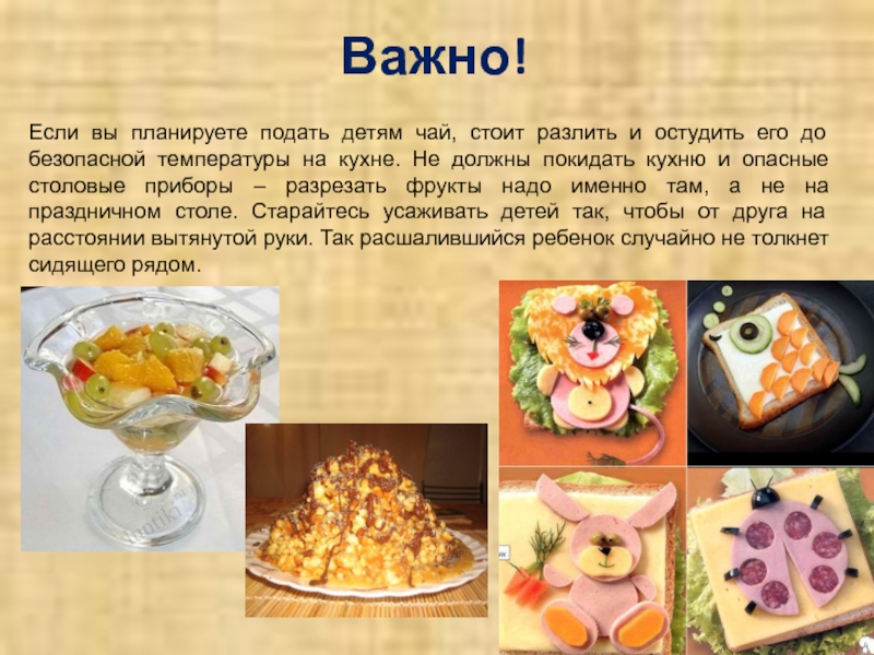 до безопасной температуры на кухне. Не должны покидать кухню и опасные столовые приборы – разрезать фрукты надо именно там, а не на праздничном столе. Старайтесь усаживать детей так, чтобы от друга на расстоянии вытянутой руки. Так расшалившийся ребенок случайно не толкнет сидящего рядом.